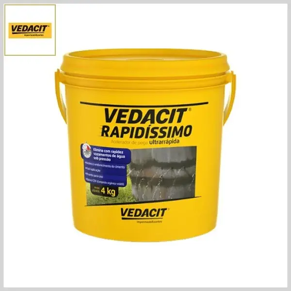 Vedacit Rapidíssimo é um aditivo acelerador de pega ultrarrápida para cimentos, permitindo o tamponamento instantâneo de vazamentos e infiltrações. Sua fórmula proporciona também o rápido endurecimento e resistências iniciais ao cimento utilizado nas argamassas e concretos.