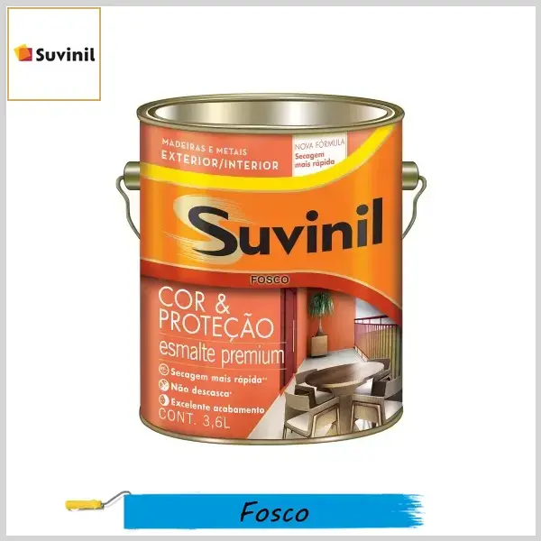 Esmalte Sintético Suvinil Cor & Proteção, é um produto de fácil aplicação com características de alta resistência às intempéries com acabamentos acetinado, brilhante ou fosco. Possui ótima secagem, excelente acabamento e sua fórmula siliconada permite uma menor aderência de sujeira facilitando a limpeza. A segunda demão pode ser aplicada após 45 minutos, mesmo que a primeira ainda não esteja seca.