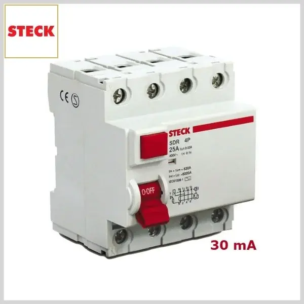 Interruptor Diferencial SDR Tetrapolar 30mA x 6KA x 400V - 25 Ampéres - Steck - Ref:N000000047239