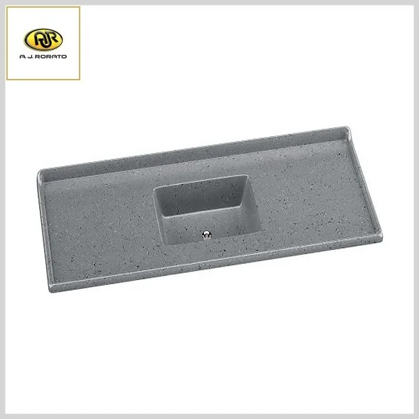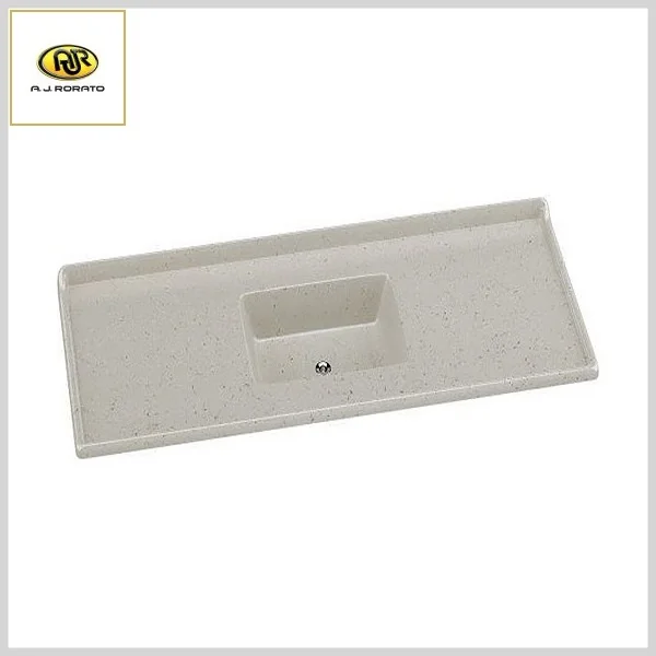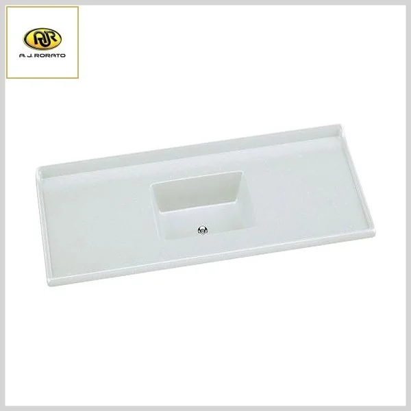 Produto em mármore sintético com espessuras reforçadas, com cobertura granitada de gel coat e com brilho e resistência incomparáveis. Superfícies mais lisas e sem porosidade, proporcionam maior higiene e fácil limpeza. O protetor de parede e suas bordas altas evitam o derramamento acidental no manuseio da água.