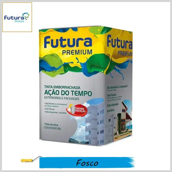 A Tinta Acrílica Ação do Tempo Futura Premium é um produto indicado para proteção de superfícies internas e externas de paredes, fachadas, muros de alvenaria ou concreto, telhados de fibrocimento e de telhas galvanizadas. Protege contra a ação de intempéries naturais e maresias comumente encontradas em áreas litorâneas. Sua película emborrachada e flexível é capaz de acompanhar os movimentos de dilatação e contração de paredes, evitando o surgimento de fissuras e trincas finas dinâmicas de até 0,3mm. De fácil aplicação e com alto grau de impermeabilidade, oferece ótima cobertura e nivelamento no acabamento branco fosco ou em mais de 700 tonalidades através do Sistema Tintométrico Magia das Cores.