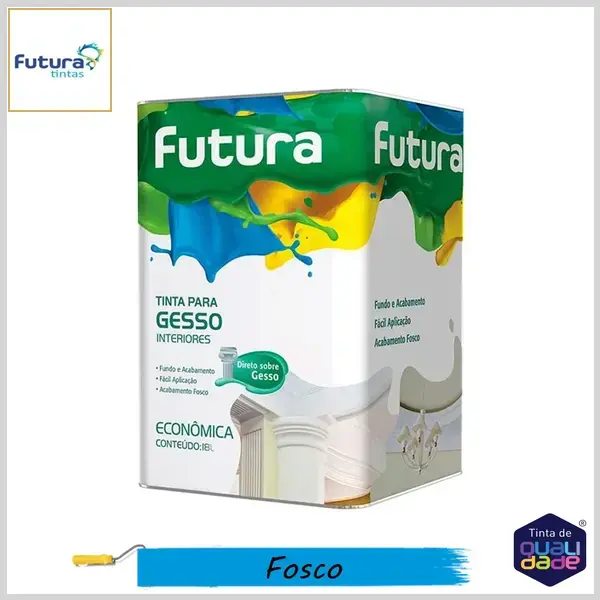 A Tinta Acrílica para Gesso Futura é uma tinta branca de qualidade econômica, indicada para pintura direta sobre superfícies de gesso, placas de gesso ou acartonados (drywall). Sua fórmula especial age como fixadora de partículas soltas sobre gesso, proporcionando um melhor acabamento sem a necessidade de utilização de fundos preparadores. Possui ótimo poder de cobertura, secagem rápida, alastramento e rendimento, com acabamento fosco, além de oferecer boa resistência às intempéries.