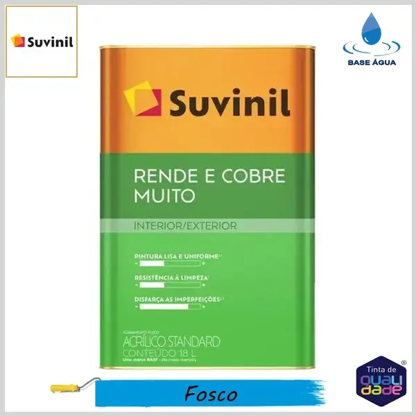 Suvinil Rende e Cobre Muito é uma tinta acrílica standard fosca de ótima cobertura, com baixo odor e excelente rendimento e alastramento, além de possuir uma ótima consistência que facilita a aplicação do produto após a sua diluição. É indicada para a pintura de superfícies em ambientes internos e externos de reboco, massa acrílica, massa corrida, texturas, concreto, fibrocimento e gesso. Obtenha mais informações sobre o produto consultando o Boletim Técnico anexado à esta página.