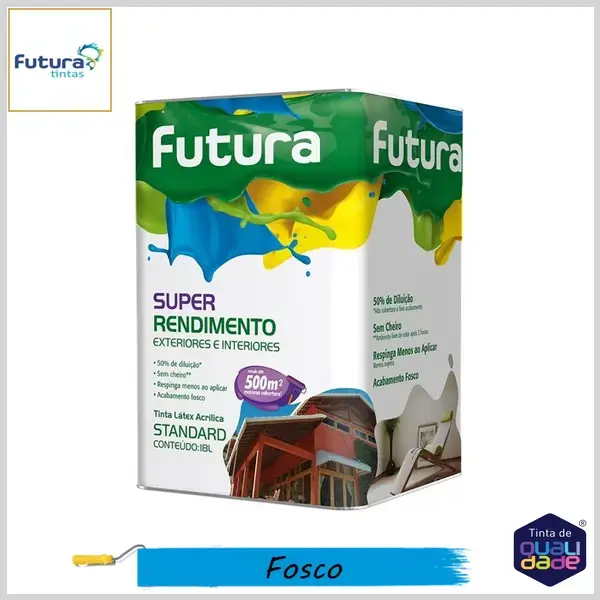 A Tinta Látex Acrílica Super Rendimento Futura Standard é um produto à base de látex acrílico com alta consistência e mínimo odor residual após 3h de aplicação, em ambiente ventilado. Pode ser diluída com até 50% de água limpa, possibilitando excelente cobertura e alto rendimento (até 500m²/lata/demão), ótimo alastramento e acabamento, com boa resistência ao intemperismo. É indicada para pintura de superfícies internas e externas de alvenaria, massa corrida, massa acrílica, texturas, gesso e fibrocimento. Disponível em diversas cores prontas no acabamento fosco ou em até 2000 tonalidades, pelo Sistema Tintométrico Magia das Cores.