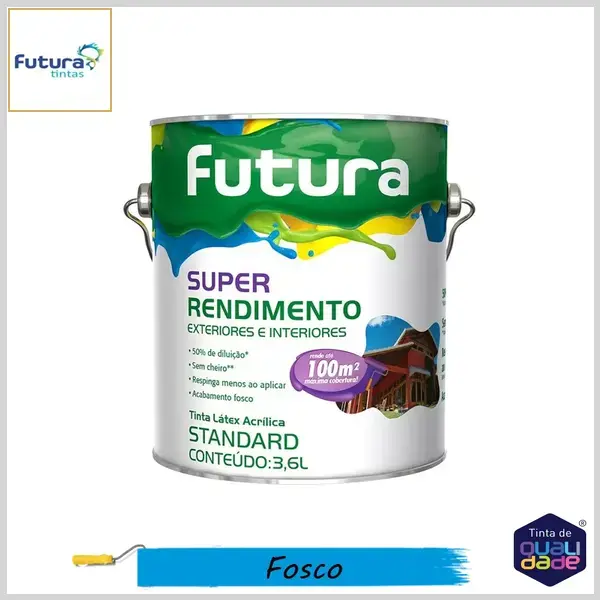 A Tinta Látex Acrílica Super Rendimento Futura Standard é um produto à base de látex acrílico com alta consistência e mínimo odor residual após 3h de aplicação, em ambiente ventilado. Pode ser diluída com até 50% de água limpa, possibilitando excelente cobertura e alto rendimento (até 500m²/lata/demão), ótimo alastramento e acabamento, com boa resistência ao intemperismo. É indicada para pintura de superfícies internas e externas de alvenaria, massa corrida, massa acrílica, texturas, gesso e fibrocimento. Disponível em diversas cores prontas no acabamento fosco ou em até 2000 tonalidades, pelo Sistema Tintométrico Magia das Cores.