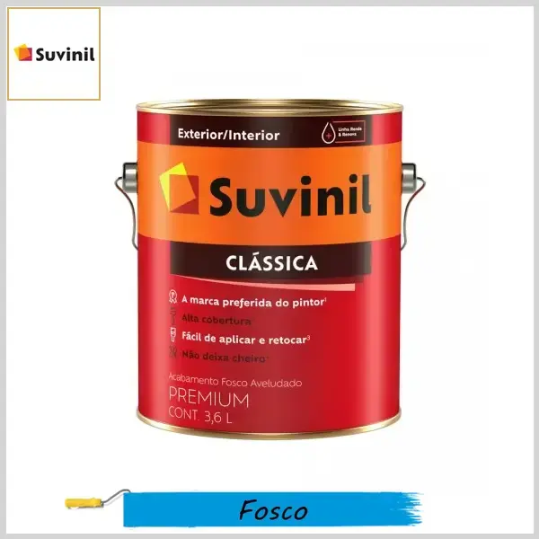 Com a tinta Suvinil Clássica não tem erro, é fácil aplicação e fácil retoque. É a tinta mais tradicional da Suvinil, que se renova com o tempo e te ajuda a renovar a sua casa.